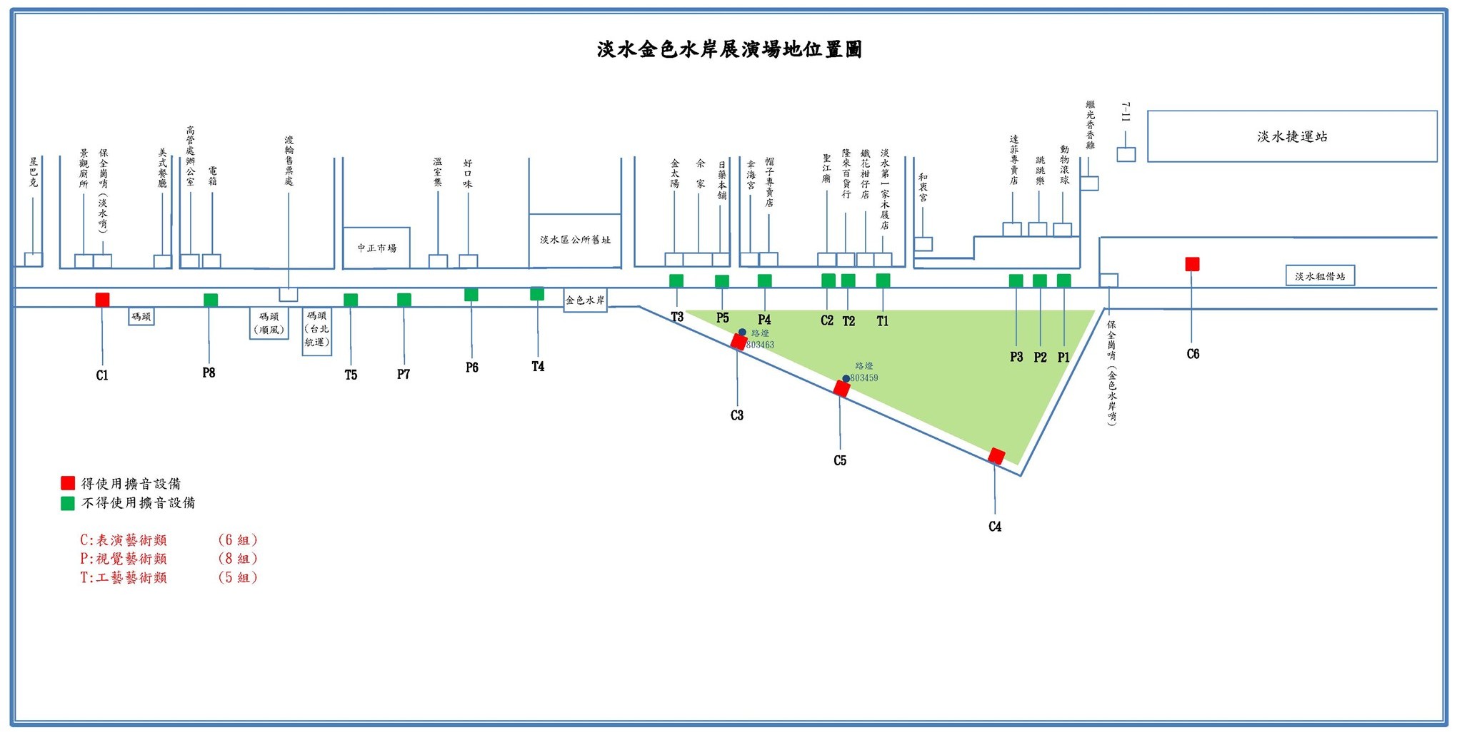 為顧及行動雕像、肢體劇場等展演類型藝人權益,金色水岸自114年12月1日起新增「C2」點位。