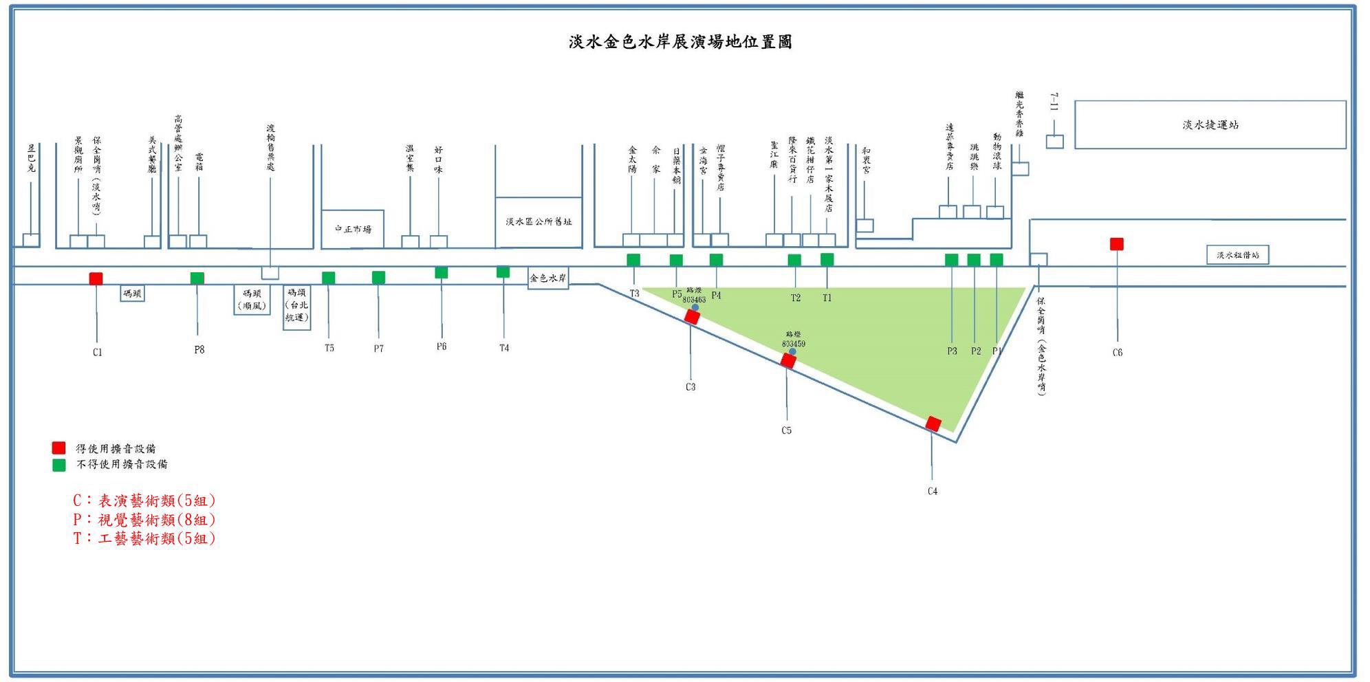 【表演藝術類5組、視覺藝術類8組、工藝藝術類5組。詳見下方「淡水金色水岸展演場地位置圖」】